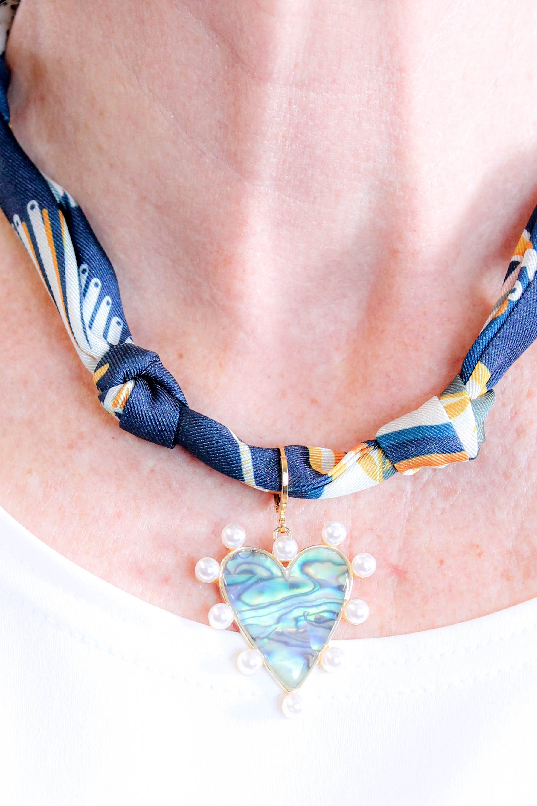 Featuring a shimmering Abalone heart and classic faux pearl accents, this Gemelli Scarf Necklace balances organic texture with refined detail.