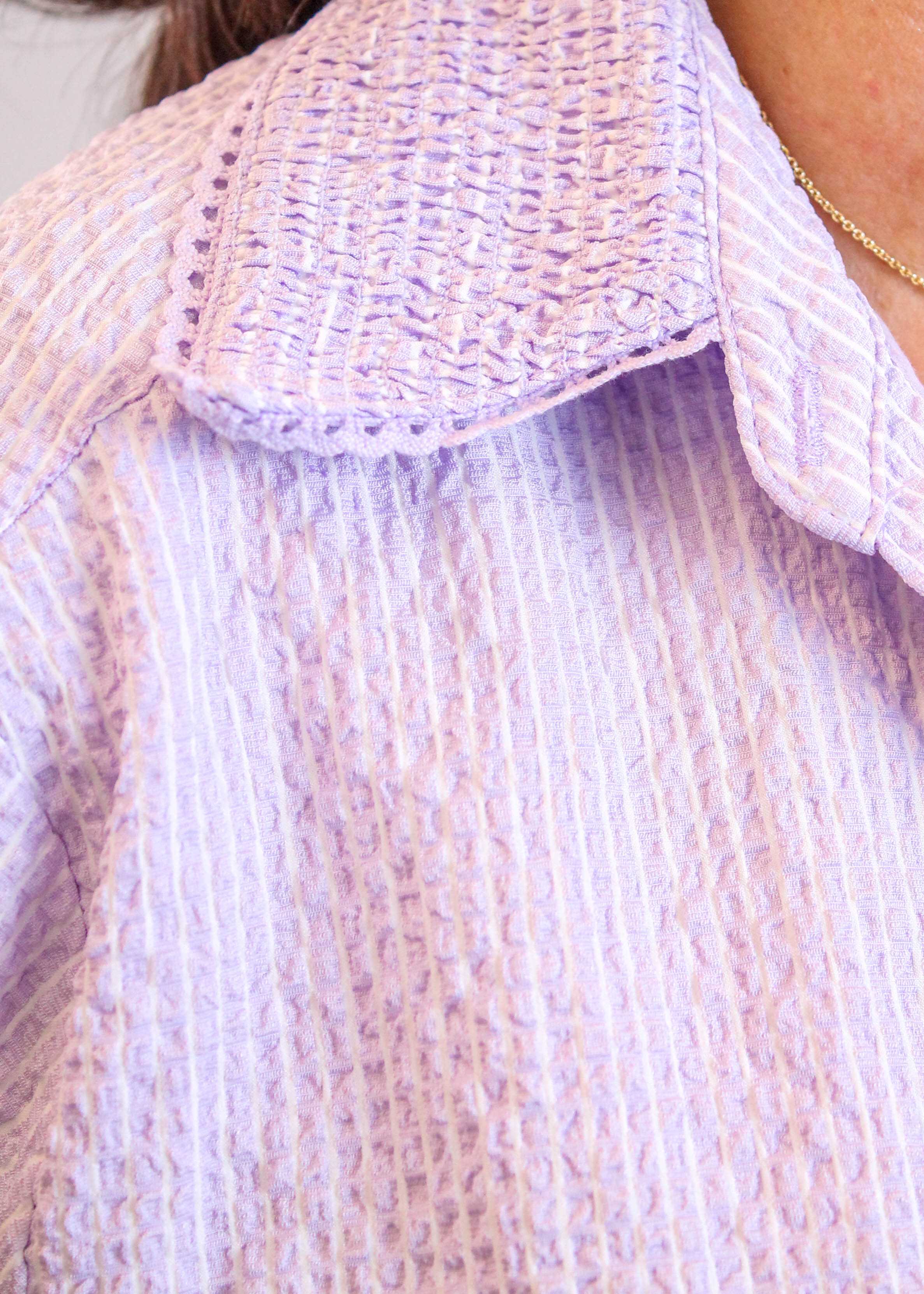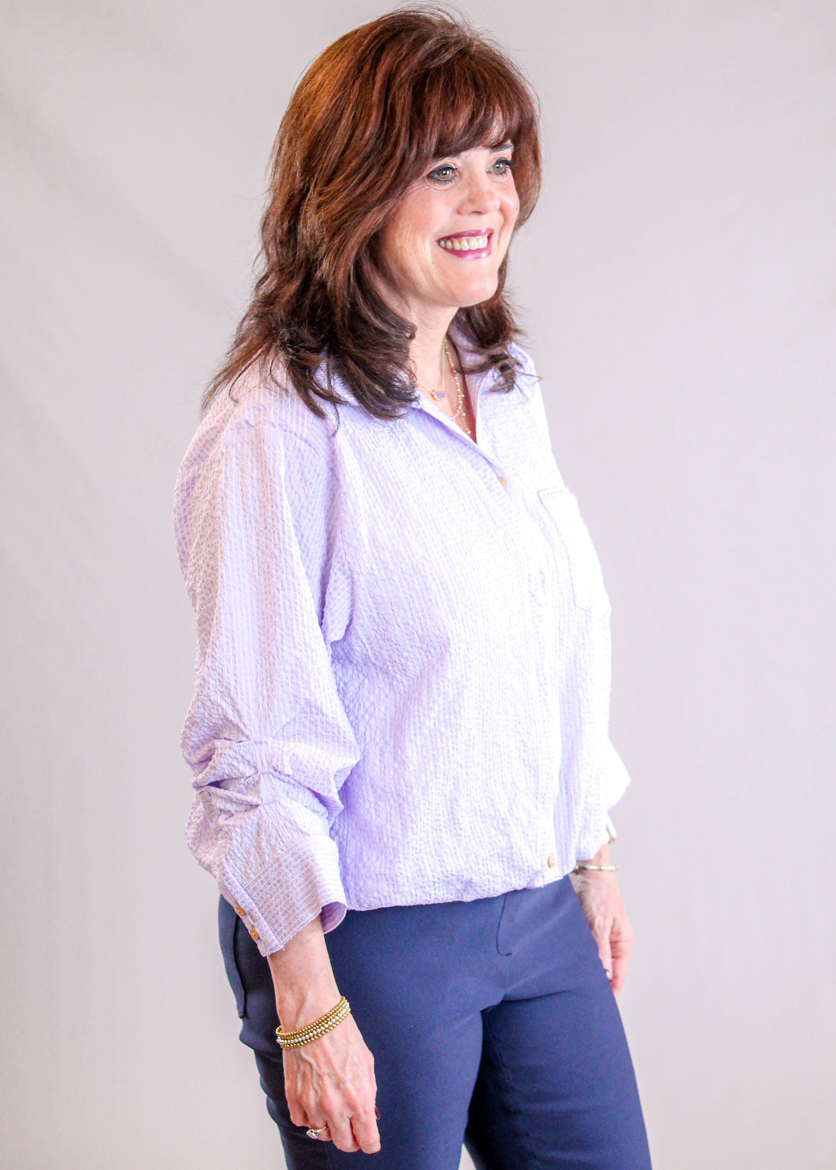 Crafted in soft lavender with a soft white stripe, the Democracy Bubble Hem Top features ruched sleeves for a 3/4 fit and a gently structured bubble hem.