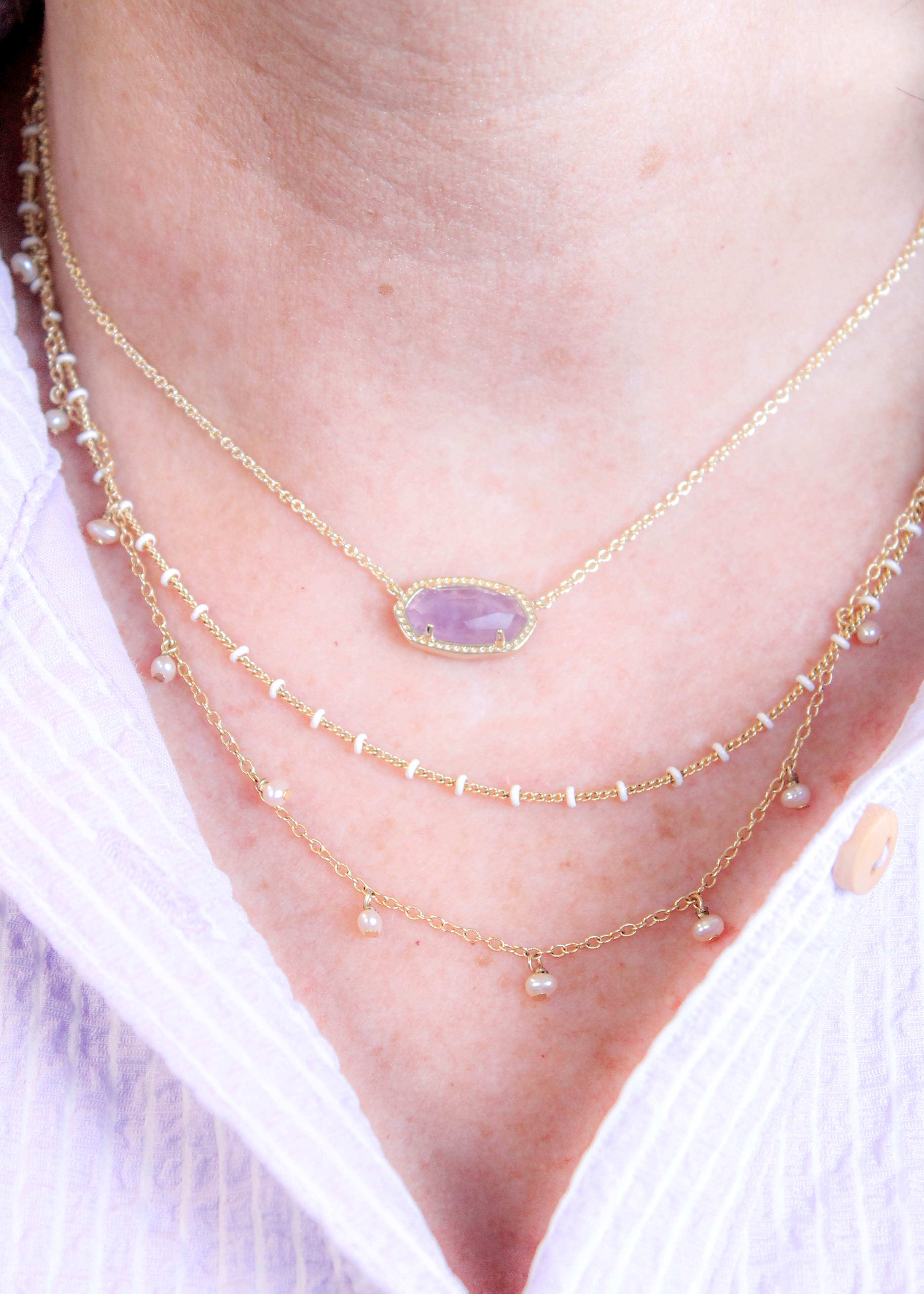 The Kendra Scott Elisa Gold Necklace with Amethyst Pendant features a luminous stone that rests gracefully at the neckline with soft, light-reflecting depth.