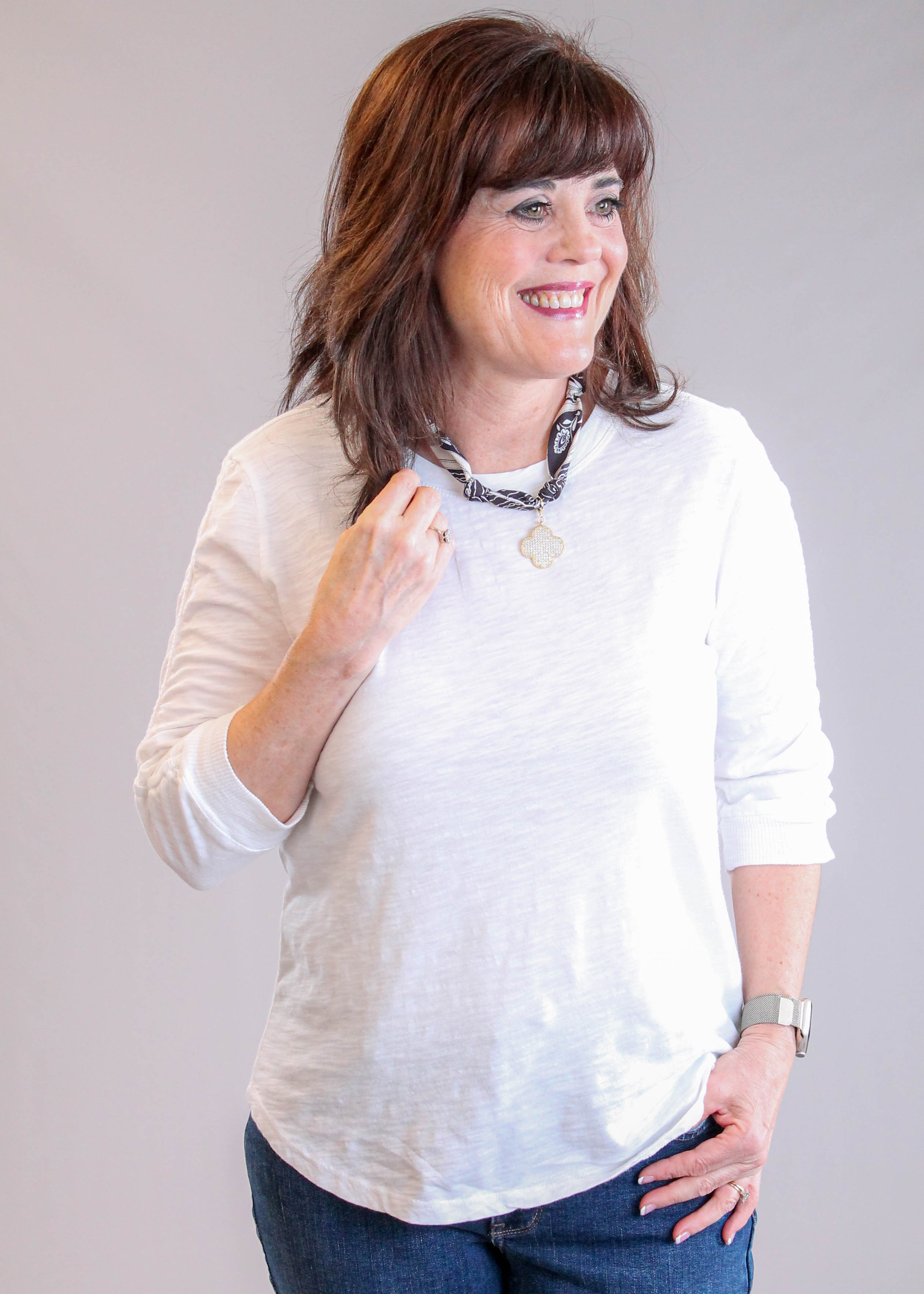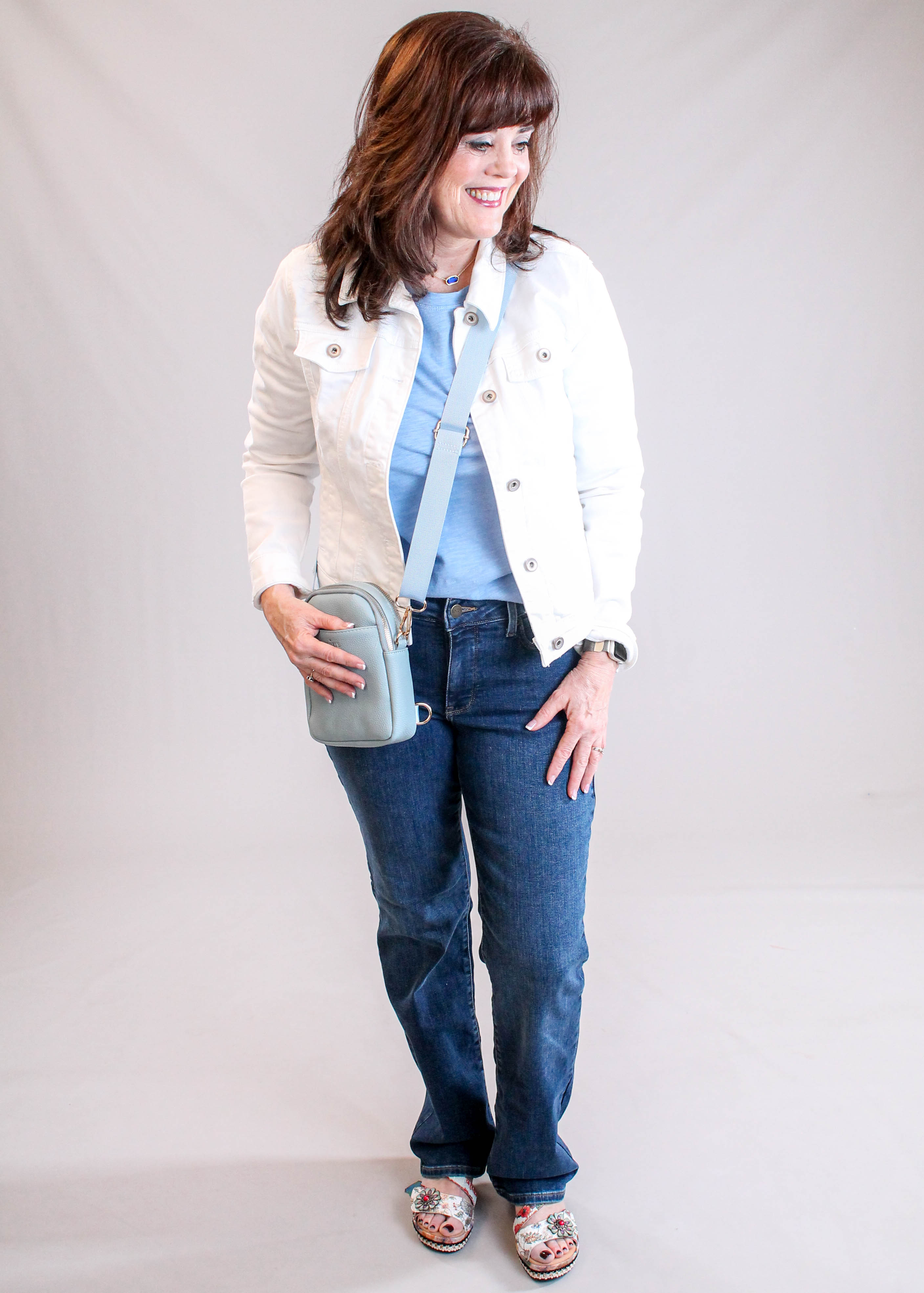 Our Styling Tips: We love this item paired with our NYD Jeans in Cooper rinse, pictured here.  It would also look great with with a jean jacket.  Finish your look with any of our Kedzie Crossbody bags and Kendra Scott Elisa Gold and Cobalt Blue Pendant Necklace. The Colette Gold Earrings are the perfect choice to compliment the necklace (sold separately).