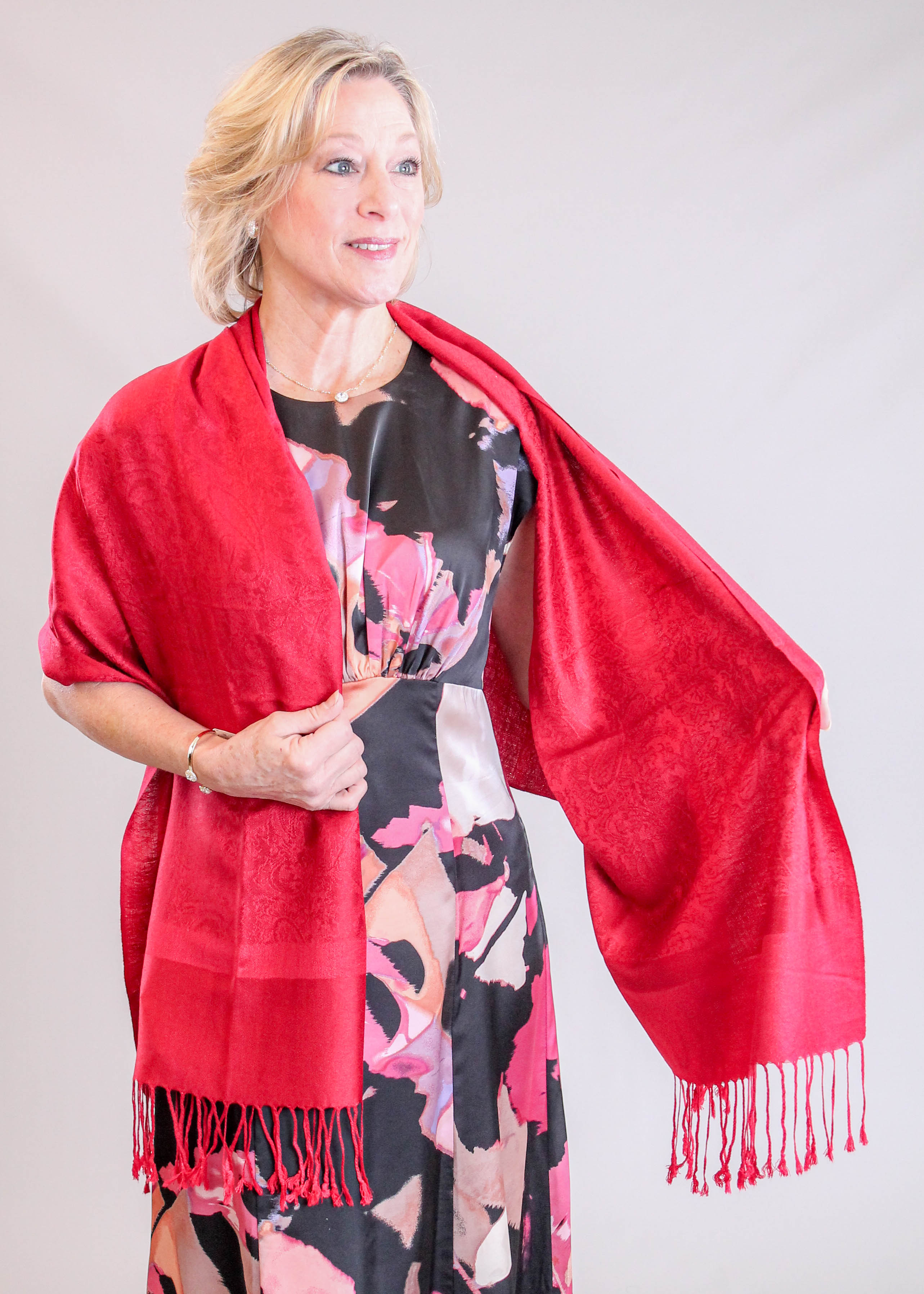 Our Styling Tips: A beautiful alternative to a jacket when we just need a light layer, this Barn Red Pashmina scarf is the perfect choice. It pairs lovely with the Maggy London Short Sleeve Abstract Dress.