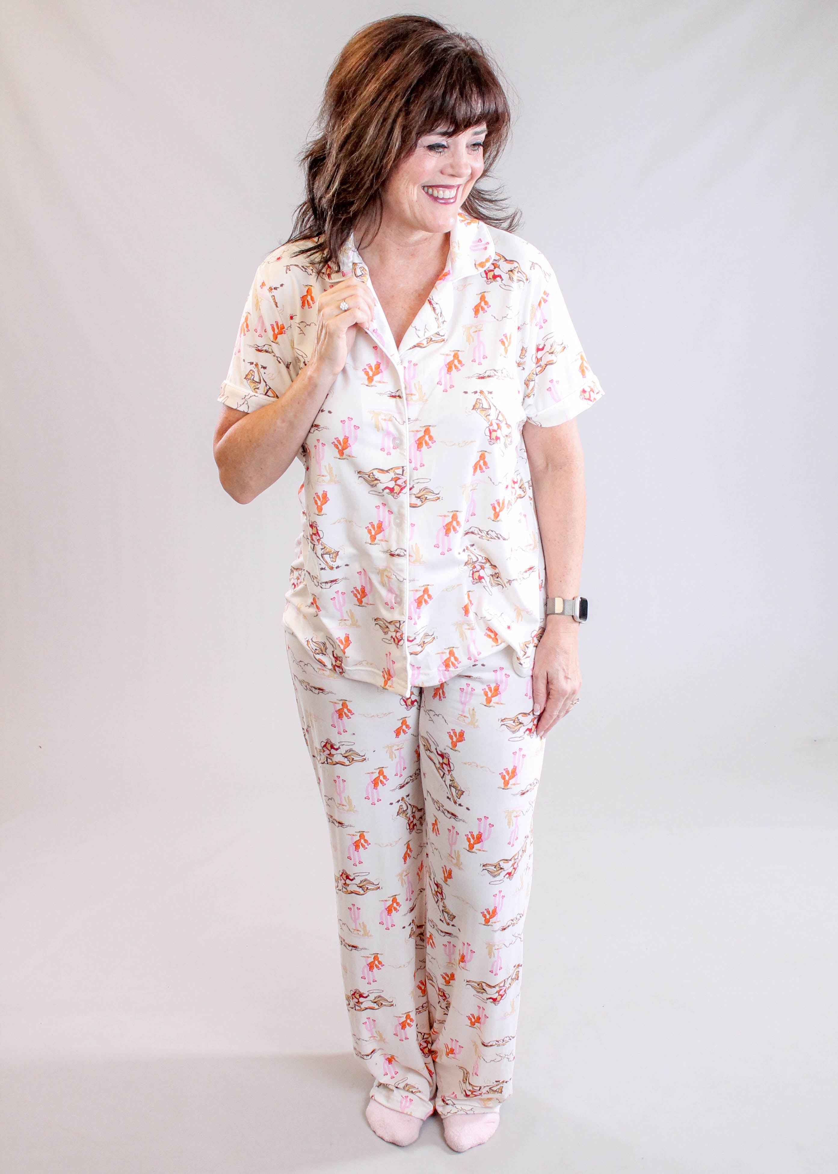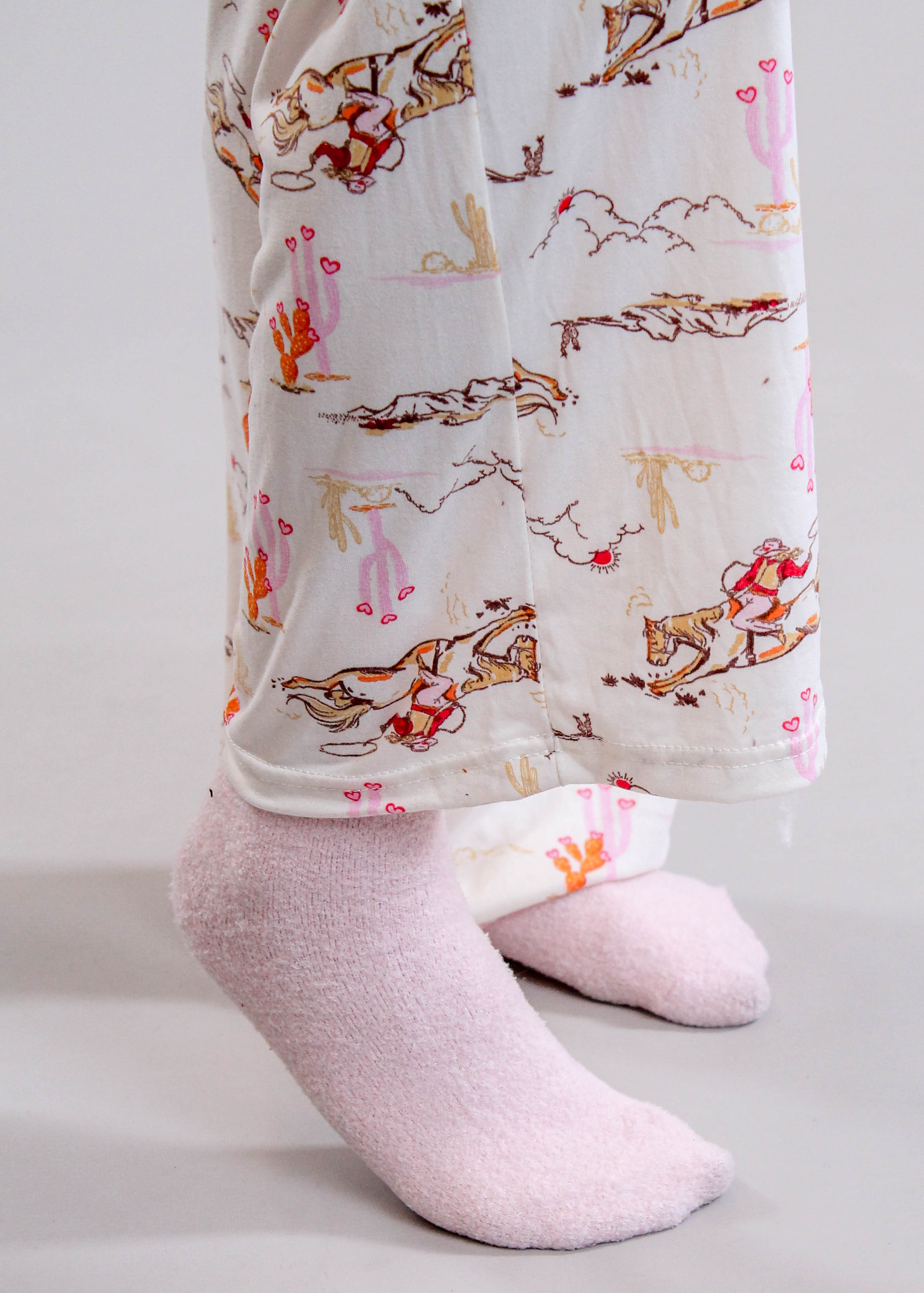 The Hello Mello Drawstring Waist Pajama Pant with Cowgirls and Horses wraps you in soft, breathable fabric with a comfortable stretch waistband and playful Western print.