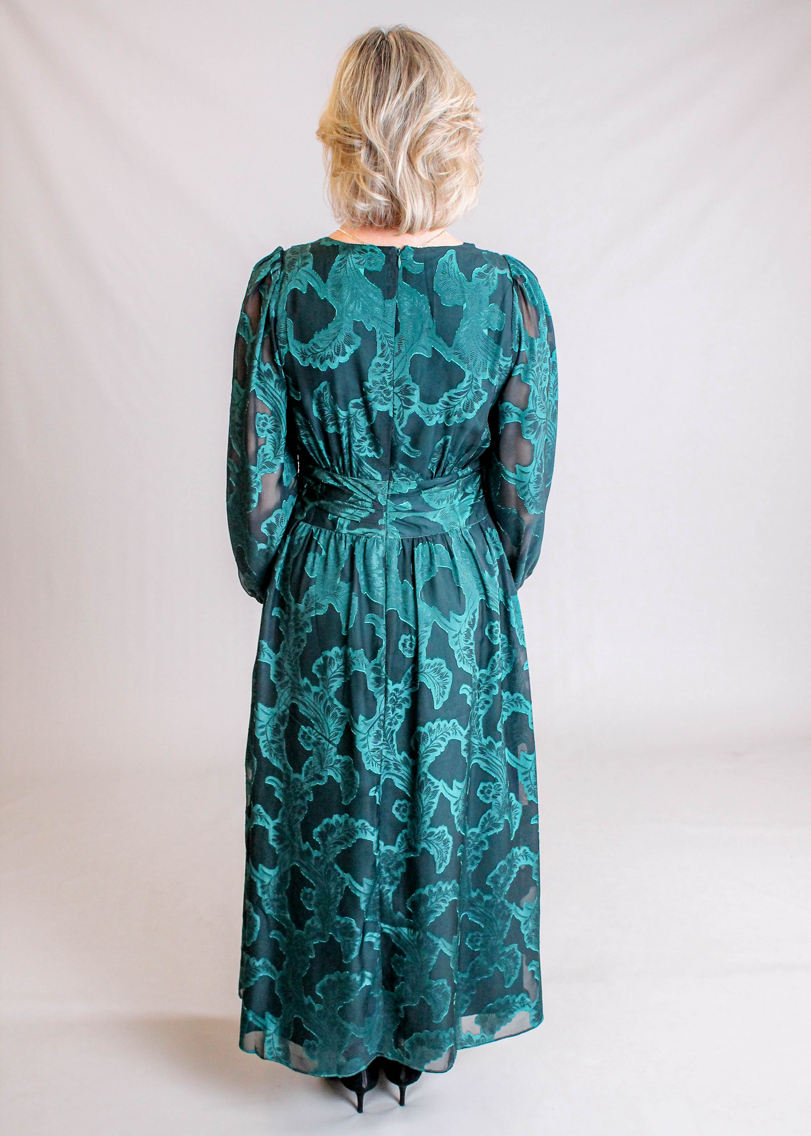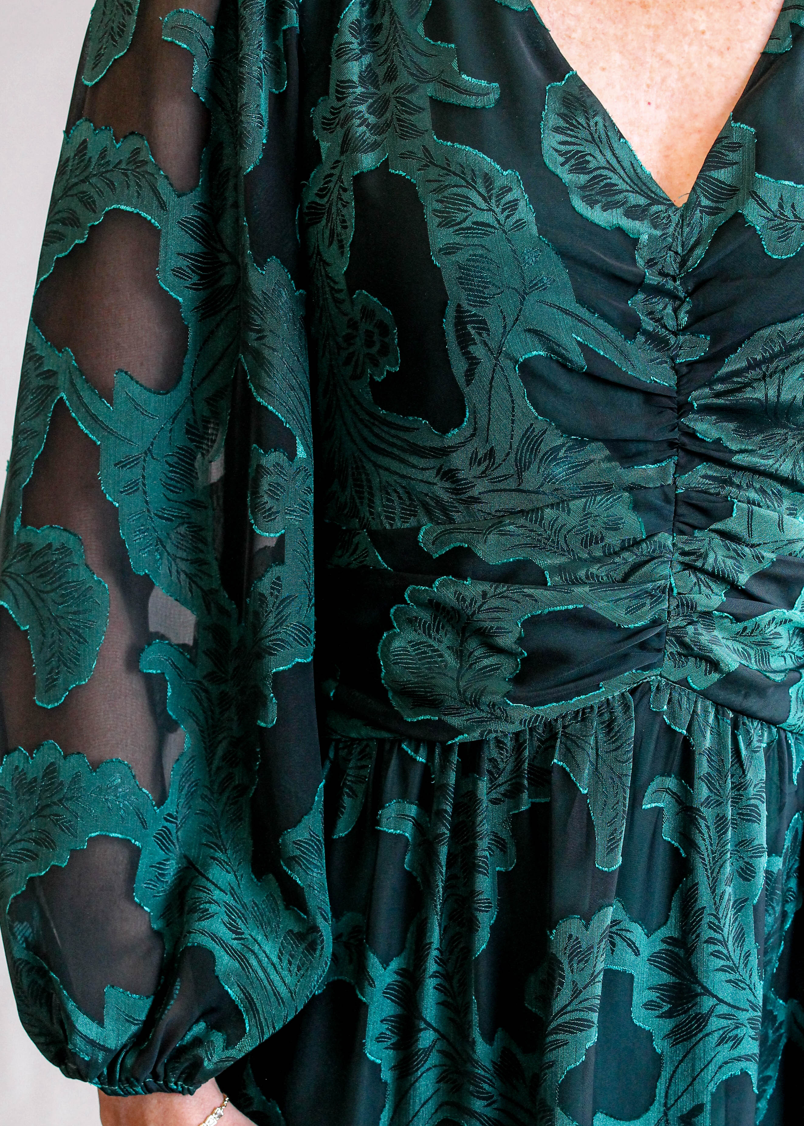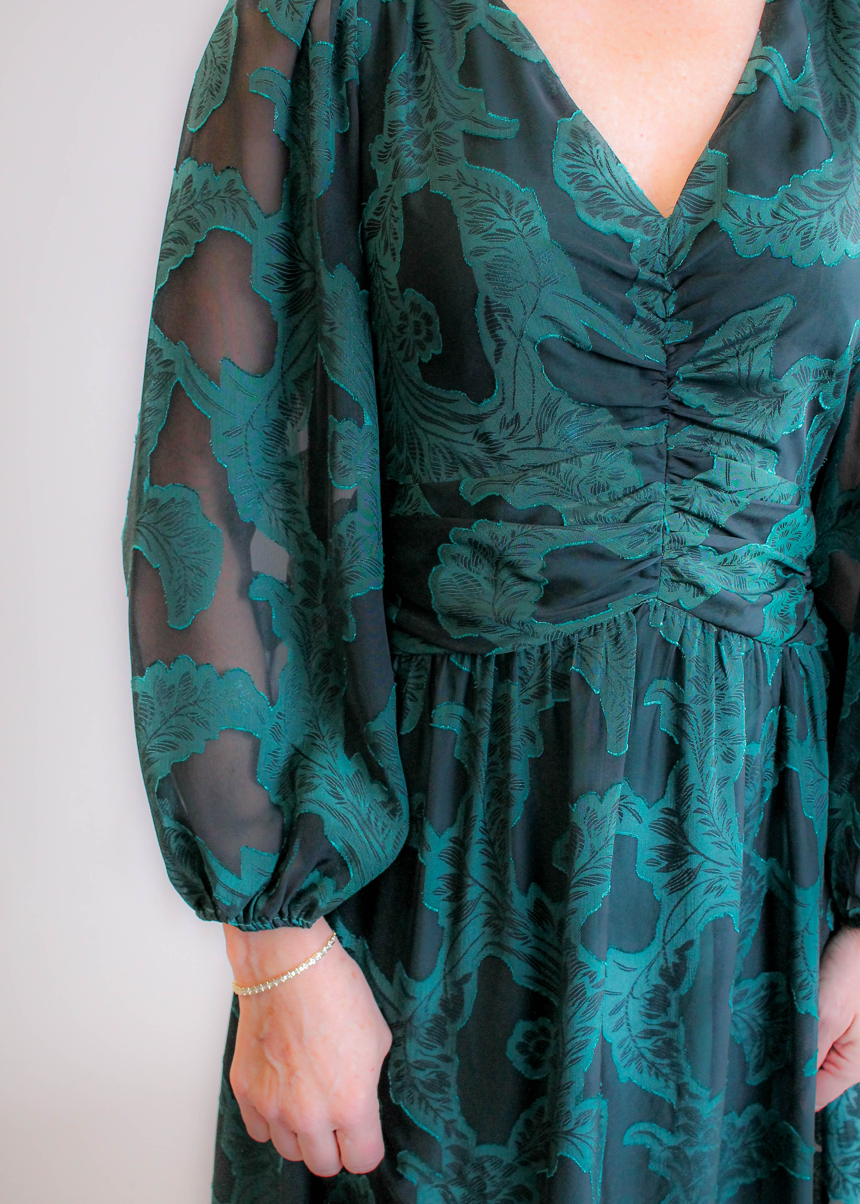 With gathered waist detail and romantic sleeves, the Maggy London V Neck Dress with 3/4 Puff Sleeves and Ruche Waist offers a graceful, feminine shape.