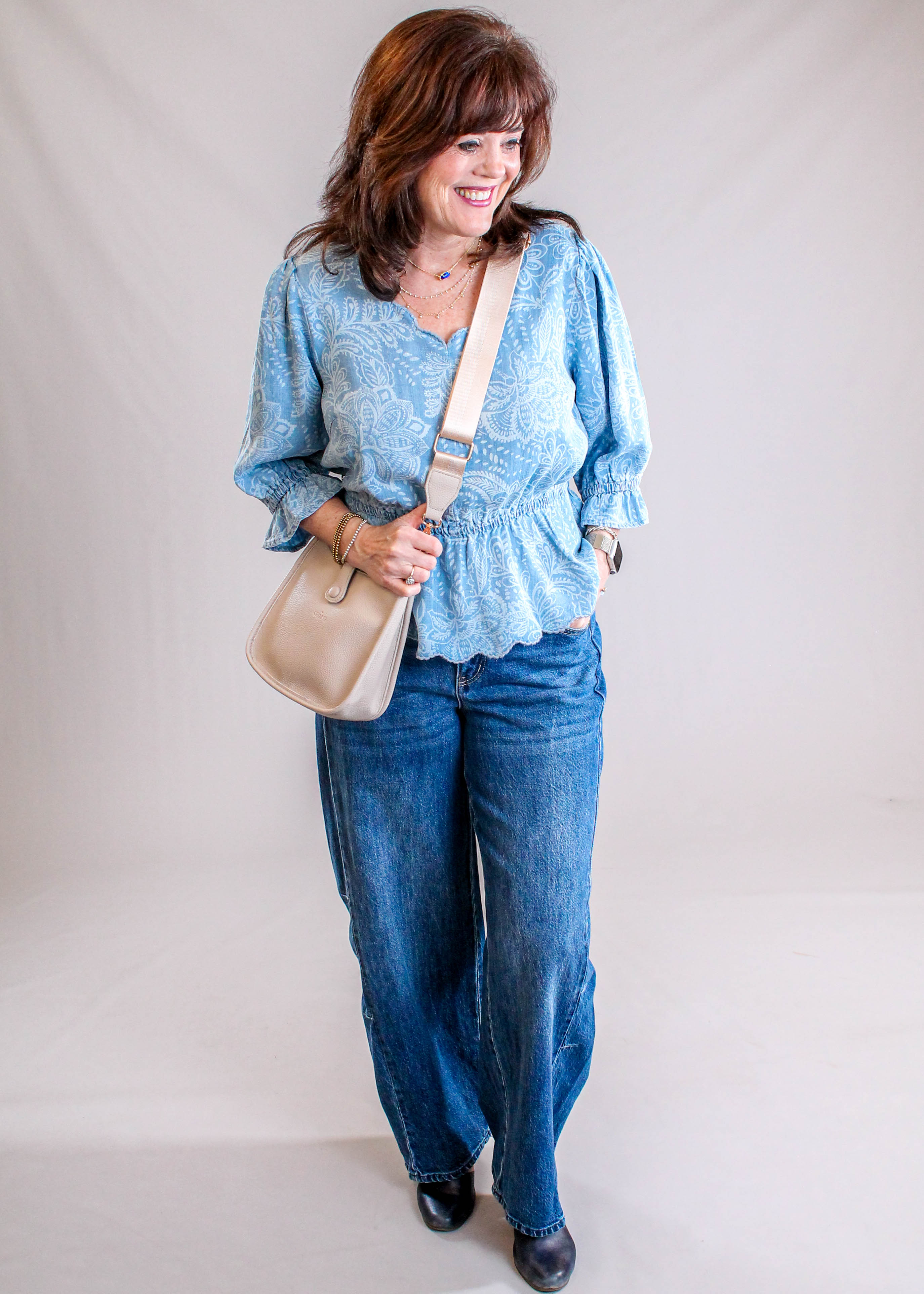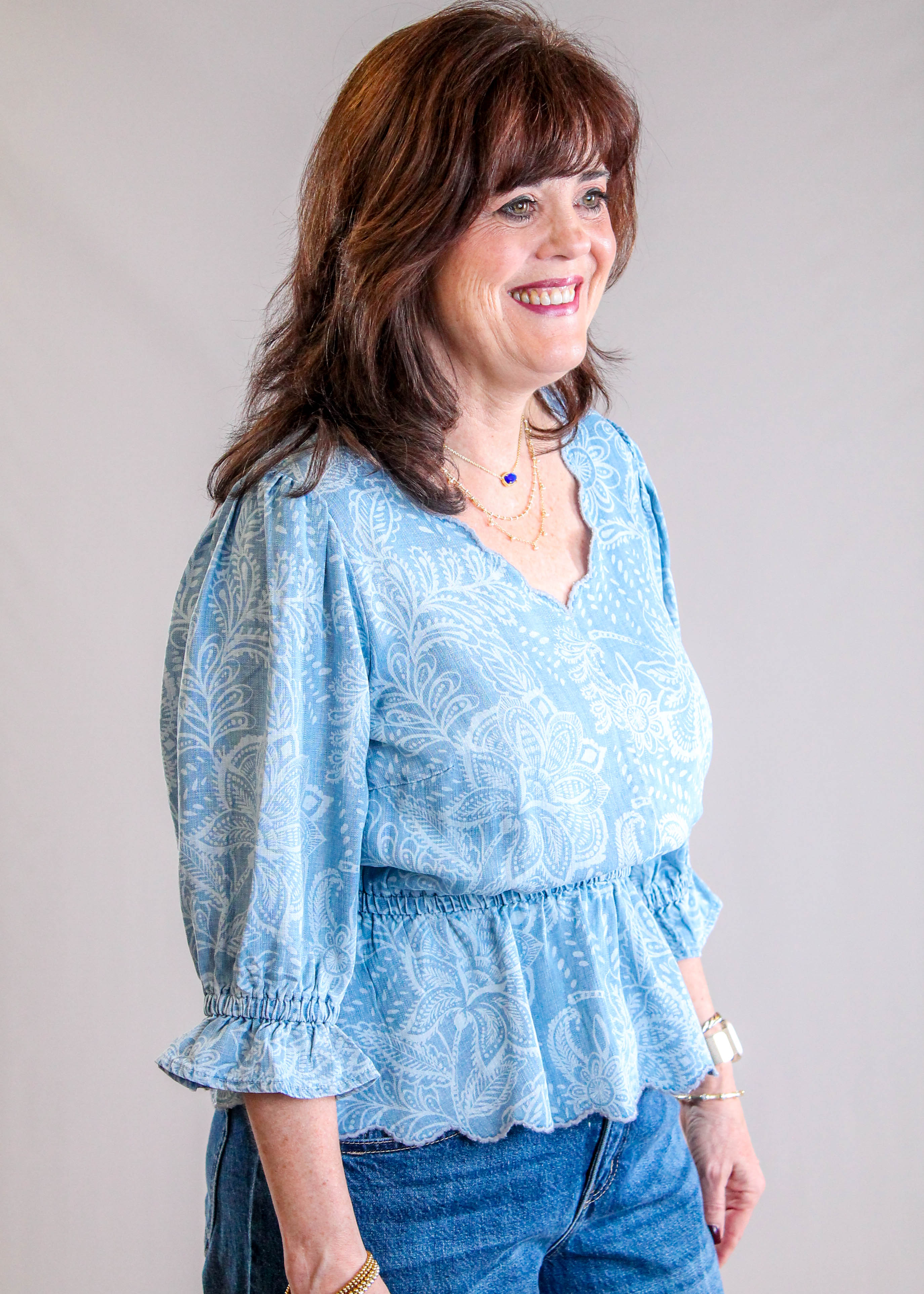 With its delicate tonal print and scalloped hem, the Democracy 100% Lyocel Denim top feels like Tencel and pairs beautifully with navy blue slacks for work or with denim for a polished casual look.