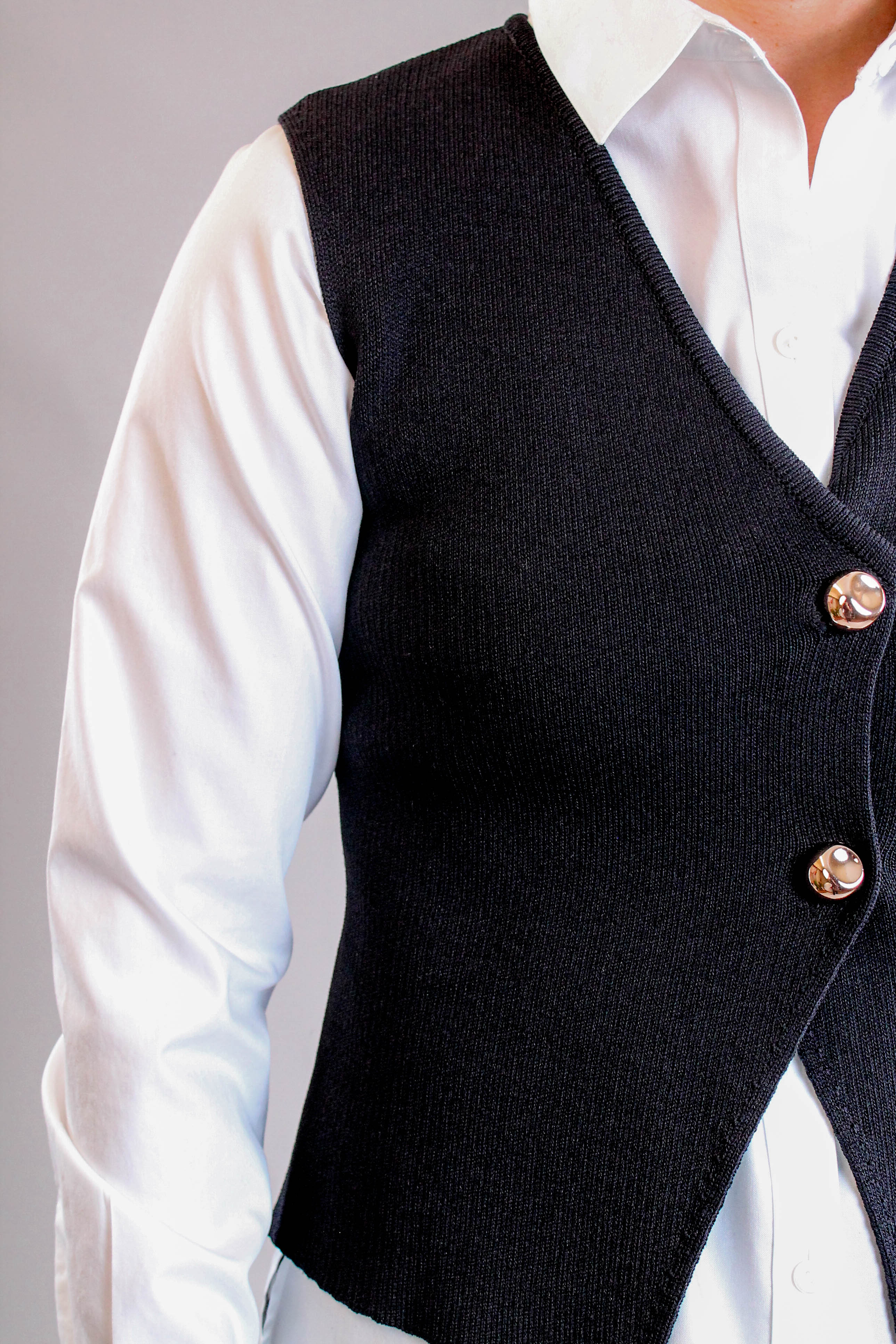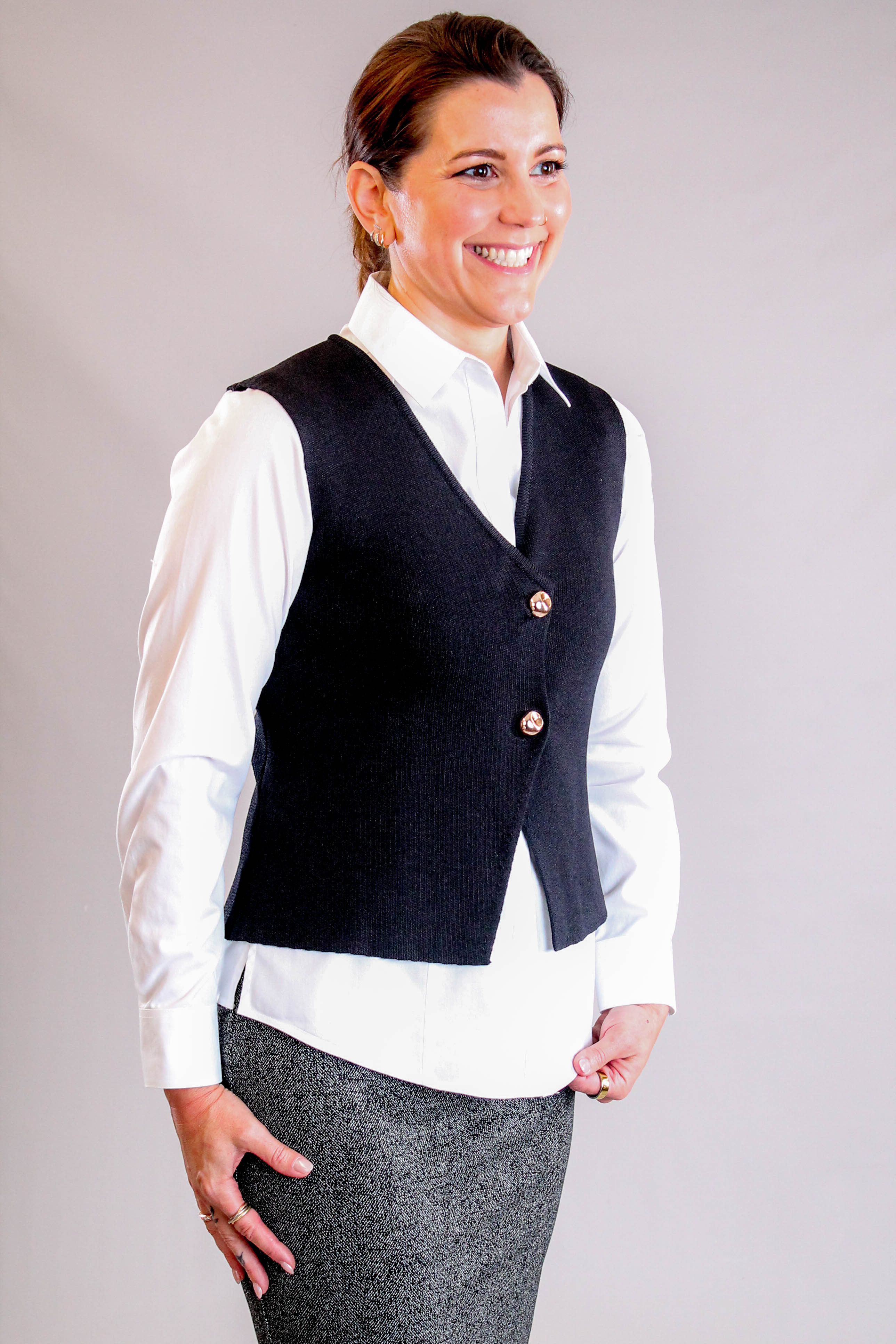 Update your look with the She + Sky Sweater Vest with Gold Buttons, featuring warm fabric and elegant gold accents at the front.