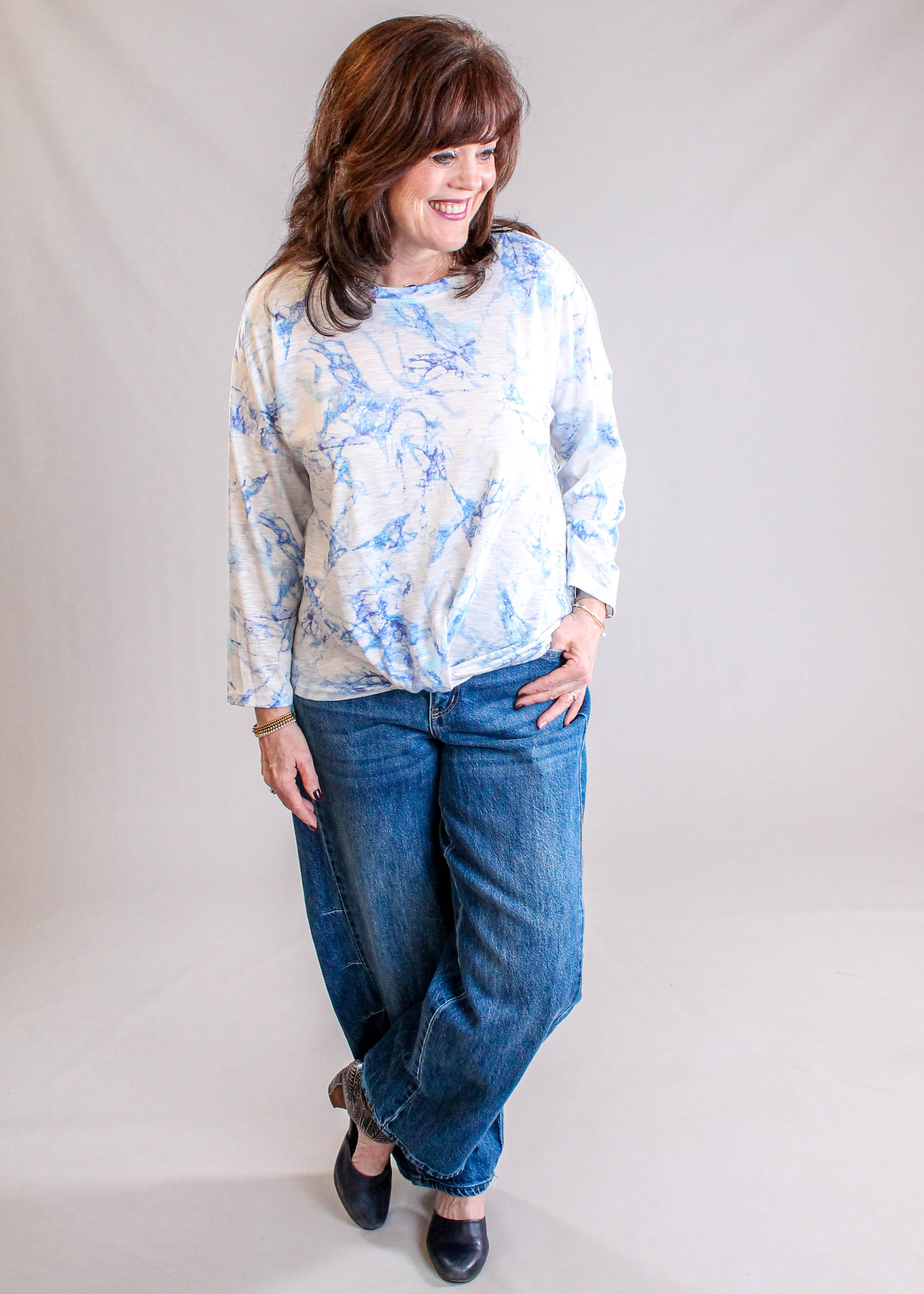 Our Styling Tips: We love this item paired with our Barely Barrel Jean, pictured here. It would also look great half tucked with the Tribal Sportswear Flatten It Pant in Navy. Finish your look with our Kendra Scott Elisa Gold and Blue Cat's Eye Necklace and Huggie Crystal Earrings (Sold Separately).