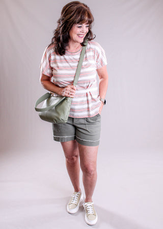 Democracy Soft Stripe Cotton Knit Top with Double Pleated side in Cream or Gray